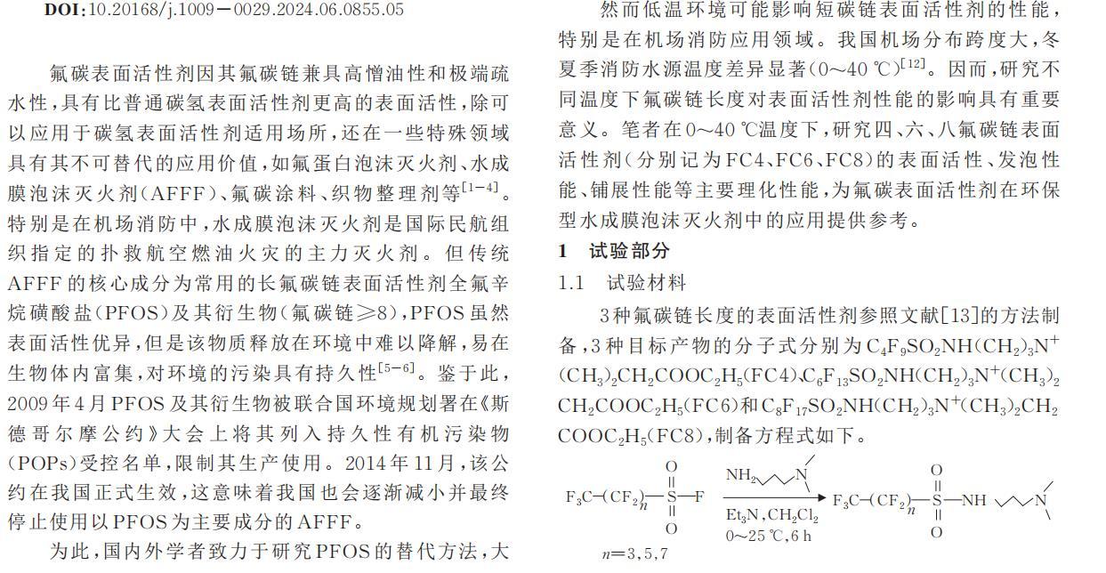然而低溫環(huán)境可能影響短碳鏈表面活性劑的性能,特別是在機場消防應用領域。我國機場分布跨度大,冬夏季消防水源溫度差異顯著(0~40℃)。因而,研究不同溫度下氟碳鏈長度對表面活性劑性能的影響具有重要意義。筆者在0~40℃溫度下,研究四、六、八氟碳鏈表面活性劑(分別記為FC4、FC6、FC8)的表面活性、發(fā)泡性能、鋪展性能等主要理化性能,為氟碳表面活性劑在環(huán)保型水成膜泡沫滅火劑中的應用提供參考。