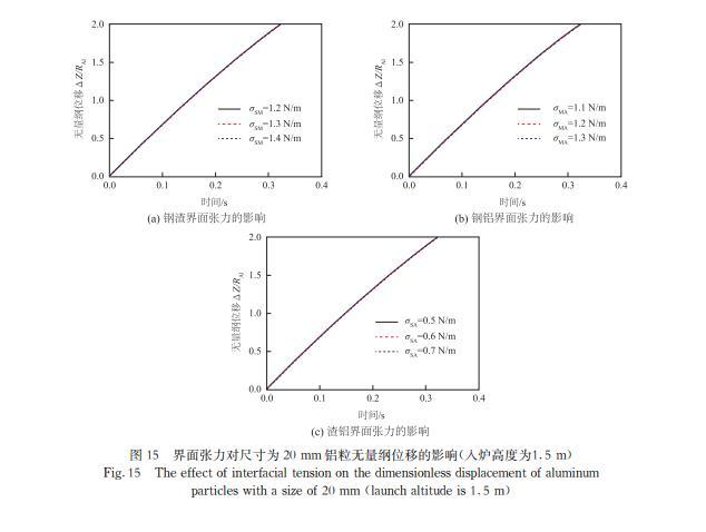 增加鋼渣界面張力、減小鋼鋁界面張力或增加渣鋁界面張力有利于鋁粒進(jìn)入鋼液,而鋁粒的尺寸大于20 mm,界面張力對鋁塊運(yùn)動幾乎沒有影響;增大密度會使鋼芯鋁在鋼液中停留更長時間,有利于鋼液脫氧。