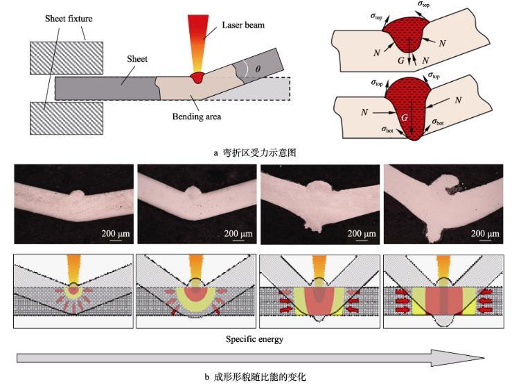 通過觀察激光熱應力成形過程中彎折處的形貌發(fā)現(xiàn),激光熱輸入、彎曲角度和成形機制會影響彎折區(qū)材料表面的擠壓、熔化、流動和凝固過程,以及材料內(nèi)部的溫度梯度和界面表面張力,這些影響導致彎折區(qū)域的輪廓形貌、粗糙度、顯微組織、硬度分布發(fā)生變化。在激光熱應力成形過程中,熔池的受力情況如圖1a所示。一方面,當比能較小且熔凝區(qū)僅存在金屬板上表面時,薄板彎折處的增厚主要受到左右兩側和下側冷端材料的約束作用,通過作用于上側材料,且上表面局部熔化的材料在頂端表面張力的作用下,形成了頂部凸起的形貌。同時,由于激光瞬態(tài)作用時間較短,熔融材料在激光掃描結束后快速凝固,并在掃描次數(shù)逐漸增加的過程中形成連續(xù)隆起的形貌,在彎折處形貌演變過程中粗糙度逐漸增大。在高比能下,薄板彎折處材料的熔化凝固和塑性變形受到左右兩側材料的橫向約束,該區(qū)域在左右兩側材料的擠壓下增厚。