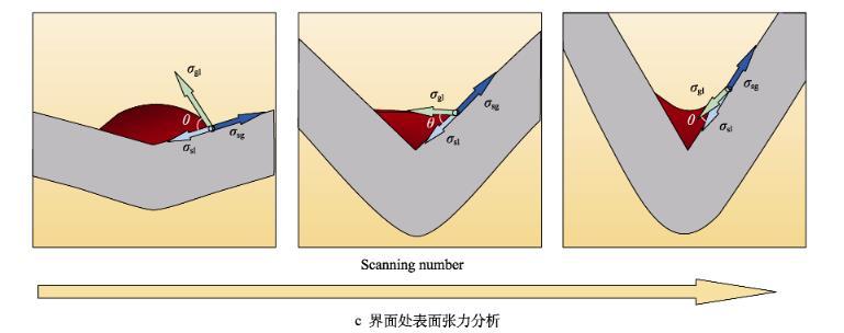 另一方面,材料內(nèi)部的溫度梯度和界面表面張力亦會導致彎折區(qū)的形貌發(fā)生改變。通過觀測不同比能和掃描次數(shù)下薄板彎折區(qū)的成形狀態(tài)發(fā)現(xiàn),在高比能、多次掃描下,彎折區(qū)界面的形貌由凸向凹演變,潤濕角顯著降低,如圖1c所示??梢?,比能和掃描次數(shù)是造成形貌發(fā)生變化的重要因素,最終通過影響熔池的表面張力和溫度梯度,進而影響彎折區(qū)的宏觀形貌。
