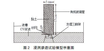 浸潤滲透試驗(yàn)?zāi)P腿鐖D2所示,主要由液槽、支撐三腳架和透明有機(jī)玻璃管組成。有機(jī)玻璃管直徑5cm,高15cm,頂端敞開,底部封閉鉆有直徑0.5cm的進(jìn)漿孔。試驗(yàn)時(shí)將黏土裝入有機(jī)玻璃管中,振搗壓實(shí),底部開孔處墊有紗網(wǎng),防止土體掉落。將有機(jī)玻璃管和支撐三腳架放入漿液槽內(nèi),有機(jī)玻璃管底部浸入漿液液面以下1.0cm,使?jié){液從底部滲入黏土中,通過觀察漿液在不同時(shí)間的滲透高度來評價(jià)漿液的浸潤滲透效果。