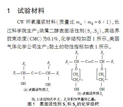 對于環(huán)氧樹脂灌漿材料,加入表面活性劑對漿液的黏度、表面張力、接觸角、固化物的力學(xué)性能及對被灌體的滲透性有何影響?目前這方面的的研究少見報(bào)道。而這些研究對環(huán)氧灌漿材料的開發(fā)以及灌漿施工都具有非常重要的意義。本文以長江科學(xué)院CW環(huán)氧灌漿材料為改性對象,加入非離子表面活性劑炔屬二醇對其改性,研究表面活性劑對環(huán)氧漿液的黏度、表面張力、接觸角、滲透性和漿液固結(jié)體力學(xué)性能的影響,在此基礎(chǔ)上探討了表面活性劑降低漿液表面張力、接觸角以及提高漿液滲透性的機(jī)理。