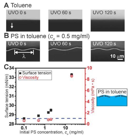 雖然熱 Marangoni 效應是次要的 對于我們的工藝,如甲苯的穩(wěn)定性所示 在圖 2(A) 中沒有 PS 的彎液面,我們相信 溶質(zhì) Marangoni 效應在超支化結構的形成中起著重要作用(圖 2B)。 支持 這個假設,我們注意到彎月面前沿,顯示在 圖 2(A,B),僅顯示甲苯的直線和 甲苯中 PS 的正弦波表明溶質(zhì) 馬蘭戈尼效應比熱馬蘭戈尼效應更重要。 產(chǎn)生的溶質(zhì) Marangoni 效應 通過濃度梯度引起的表面張力梯度,24 是濃度局部波動的結果 聚苯乙烯[圖。 2(C)]。