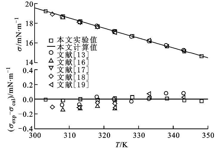 圖3正庚烷表面張力實(shí)驗(yàn)值與擬合方程和文獻(xiàn)值的比較