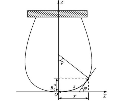 懸滴法利用測(cè)定處于重力與表面張力平衡狀態(tài)的液滴外形,獲得待測(cè)液體的表面張力。懸滴外形的幾何關(guān)系如圖1所示,在考慮液體靜壓作用的基礎(chǔ)上,由經(jīng)典Young-Laplace方程推導(dǎo)得歸一化Bashforth-Adams工作方程為,式中:σ為表面張力;φ表示外形輪廓線某點(diǎn)切線與橫坐標(biāo)夾角;s為弧長(zhǎng);R0為頂點(diǎn)曲率半徑;ρl、ρg分別表示液相和氣相密度;g代表當(dāng)?shù)刂亓铀俣?,本文取?.7965 m·s-2。