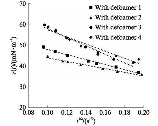 擴(kuò)散系數(shù)是指單位時間內(nèi)物質(zhì)通過單位擴(kuò)散通道橫截面的質(zhì)量。擴(kuò)散系數(shù)越大,物質(zhì)擴(kuò)散能力越強(qiáng)。利用擬合曲線斜率代入式(1),可以求得消泡劑在起泡液中極短時間范圍的擴(kuò)散系數(shù),消泡劑1、2、3、4的擴(kuò)散系數(shù)D分別為4.67×10-6、2.43×10-6、1.33×10-5、9.24×10-6m2/s,在10-5到10-6數(shù)量級。