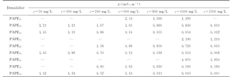 PAPE11、PAPE12和PAPE13是相對分子質(zhì)量相當(dāng)、HLB值逐漸增大,亦即其親水性逐漸增強的3個破乳劑樣品。從表3還可以看出,在同樣的破乳劑濃度下,HLB值越大的破乳劑降低油-水界面張力的幅度越大,油-水界面張力越低,甚至發(fā)生數(shù)量級的變化;而要將油-水界面張力降低至同樣的水平,HLB值大的破乳劑所需要的濃度則更低,即其降低油-水界面張力的效率越高。PAPE21、PAPE22和PAPE23以及PAPE31、PAPE32和PAPE332個系列的破乳劑隨著HLB值的增大也表現(xiàn)出同樣的規(guī)律。PAPE12、PAPE22和PAPE32是保持HLB值相當(dāng)、相對分子質(zhì)量逐漸增大的3個破乳劑樣品,隨著相對分子質(zhì)量的增大,它們降低油-水界面張力的能力均有所增強,但增強的幅度不大,大體均在同一數(shù)量級內(nèi)變化。PAPE13、PAPE23和PAPE33是水溶性最好的一組破乳劑,隨著相對分子質(zhì)量的增大,其降低油-水界面張力的能力也有所增強,但增強幅度仍然不大。由此可見,在所研究的破乳劑相對分子質(zhì)量變化范圍內(nèi),相對分子質(zhì)量變化對PAPEmn界面活性的影響較小。