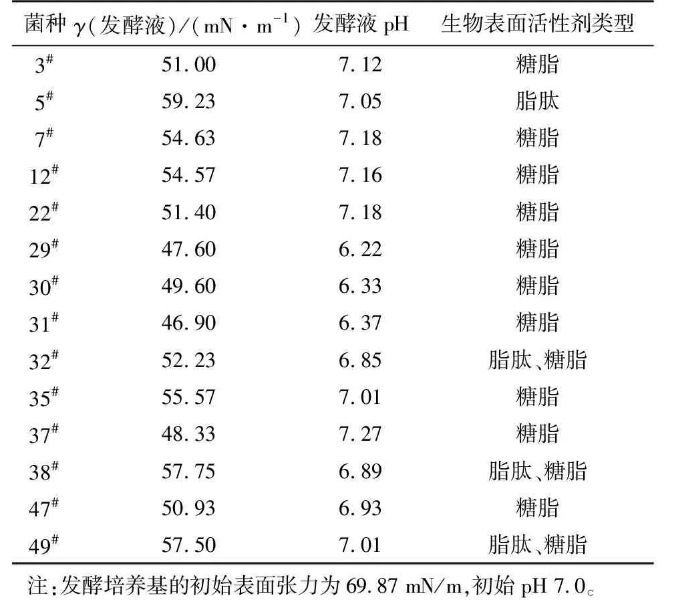 經(jīng)富集分離共得到49株細(xì)菌,初步篩選出14株生長較好的目的菌株接種于發(fā)酵培養(yǎng)基。在微生物采油過程中,表面活性劑和有機(jī)酸可以把原油從巖層中剝離下來,提高原油流動(dòng)性。因此,以發(fā)酵過程中發(fā)酵液的pH和表面張力的降低為指標(biāo),對(duì)初篩得到的菌株進(jìn)行復(fù)篩,同時(shí)分析所產(chǎn)生物表面活性劑的類型,結(jié)果見表1。