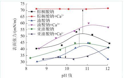 應用鉑片法對溶液表面張力進行測試,測試前使用乙醇和去離子水對測試玻璃皿進行清洗,直至測定去離子水表面張力為72±0.2 mN/m。通過NaOH調節(jié)38 mL CaCl2溶液pH值,2 mL 4×10-3 mol/L脂肪酸鈉溶液被添加到CaCl2溶液并攪拌2 min,測量并記錄pH值,然后測量溶液表面張力。