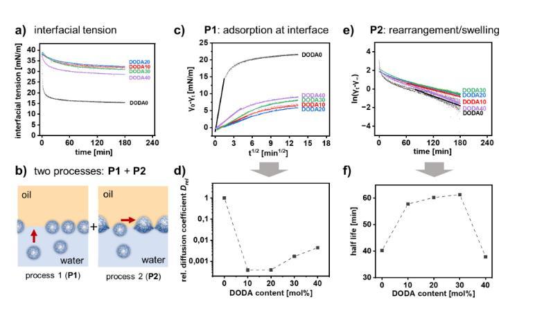 圖3展示了不同疏水性納米凝膠(ANGs)在甲苯/水界面張力(IFT)方面的研究結(jié)果。隨著ANGs的疏水性增加,甲苯/水界面張力隨時(shí)間非線性降低,但不同ANGs的降低速率不同(圖3a)。IFT的降低分為兩個(gè)階段:初始快速降低(P1)和隨后緩慢松弛到平衡狀態(tài)(P2)(圖3b)。通過(guò)分析P1階段,可以得到描述ANGs界面吸附速率的擴(kuò)散系數(shù)D(圖3c)。不同ANGs的相對(duì)擴(kuò)散系數(shù)Drel(相對(duì)于DODA0)與ANGs的DODA含量相關(guān):親水的DODA0和疏水的DODA40顯示出最快的界面吸附速率(圖3d)。通過(guò)分析P2階段,可以得到描述ANGs重新排列速率的半衰期(圖3e)。半衰期與ANGs的DODA含量相關(guān):親水的DODA0和疏水的DODA40顯示出最快的重新排列速率(圖3f)。