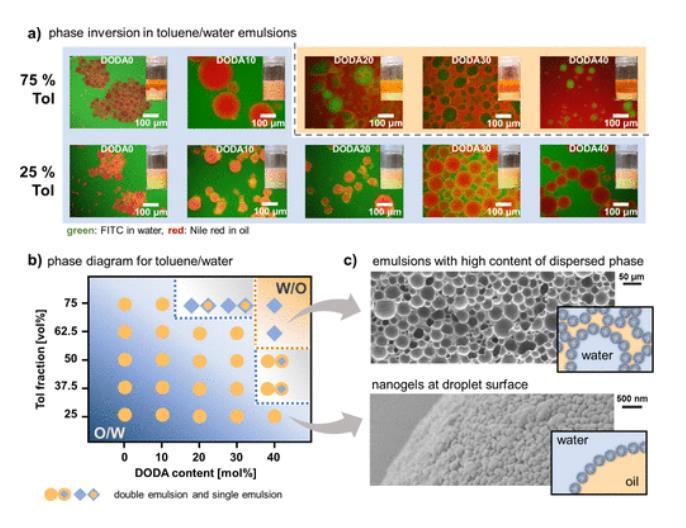 圖2展示了使用不同親水性納米凝膠(DODA含量)制備的甲苯/水Pickering乳液的類型。具體來(lái)說(shuō),圖2a通過(guò)熒光顯微鏡圖像和照片顯示了不同DODA含量下的甲苯/水乳液,其中25 vol%的甲苯觀察到O/W乳液,而在75 vol%的甲苯中,從DODA10到DODA20觀察到從O/W到W/O的相變。圖2b總結(jié)了甲苯/水乳液系統(tǒng)中乳液類型對(duì)納米凝膠的DODA含量和乳液的油相體積分?jǐn)?shù)的依賴性。圖2c通過(guò)SEM圖像展示了高分散相含量(DODA40,Tol-75)乳液和納米凝膠(DODA20,Tol-25)在粒子/液滴表面的存在。