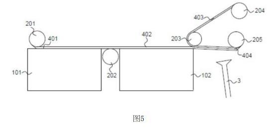 貼合輥203,設(shè)于清洗槽的尾端上方,清洗液的上表面與貼合輥底部之間的間隙不大于多層石墨烯薄膜與目標(biāo)基底的厚度之和。當(dāng)貼合輥旋轉(zhuǎn)時(shí),會(huì)將目標(biāo)基底卷到多層石墨烯薄膜的上表面,借助摩擦力將目標(biāo)基底與多層石墨烯薄膜貼合,得到石墨烯薄膜包裹的電化學(xué)陽(yáng)極404;