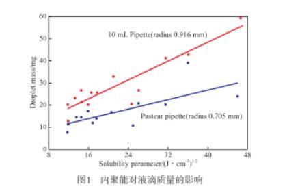 對(duì)于純物質(zhì)的溶解度參數(shù)可通過文獻(xiàn)查閱、基團(tuán)貢獻(xiàn)計(jì)算法和液體熱力學(xué)關(guān)系式計(jì)算。而礦物油為混合物,很難查到或者估算它的溶解度參數(shù)。文獻(xiàn)提供了一種溶解度參數(shù)的估算法:稱量10~20滴液體,然后計(jì)算每滴液體的平均質(zhì)量;另取2種已知溶解度參數(shù)的非揮發(fā)性液體作為參照,通過做圖大致計(jì)算出液體的溶解度參數(shù)。實(shí)驗(yàn)需保持恒溫。分別通過內(nèi)徑為0.916 mm的10 mL移液管和內(nèi)徑為0.705 mm的巴斯德移液管移取液滴,得到兩條溶解度參數(shù)與液滴質(zhì)量的關(guān)系曲線。內(nèi)聚能對(duì)液滴質(zhì)量的影響見圖1。由圖1可見,液滴的質(zhì)量與液體溶解度參數(shù)成線性關(guān)系。該估算方法可用來(lái)計(jì)算混合液體的溶解度參數(shù),適用于礦物潤(rùn)滑油溶解度參數(shù)的計(jì)算。雖然估算方法過于粗糙,但為估算礦物油等復(fù)雜混合物的溶解度參數(shù)提供了思路。文獻(xiàn)介紹了液滴的大小與液體表面張力有關(guān)。由此可見,溶解度參數(shù)與表面張力存在一定的關(guān)系。