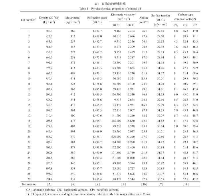29種常見的低芳淺色礦物油:取自國(guó)內(nèi)主要煉油廠的潤(rùn)滑油基礎(chǔ)油,包括主要的石蠟基基礎(chǔ)油和環(huán)烷基基礎(chǔ)油,不包括深色高芳烴礦物油;從精制程度看,包括高壓加氫深度精制油品,也包括溶劑精制和白土精制工藝精制油品;從碳型結(jié)構(gòu)看,包括芳環(huán)碳(CA)含量為零的油品,也包括CA含量小于10%(w)的油品。礦物油的理化性質(zhì)見表1。