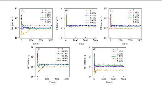 上述表征結(jié)果表明,瀝青質(zhì)及其亞組分既有疏水的烷基鏈也有含雜原子(N,S和O)的親水基團(tuán),這一結(jié)構(gòu)賦予了瀝青質(zhì)及其亞組分一定的表面活性,能有效降低IFT.圖4為p-S14-4水溶液與含有不同濃度瀝青質(zhì)及其亞組分的正十二烷模擬油DIFTs變化曲線(xiàn)。圖5為IFTmin隨瀝青質(zhì)及其亞組分濃度變化的曲線(xiàn)。