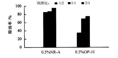 從圖2的脫附除油率來看,當(dāng)納米乳液濃度在0.5%時,除油效果最佳,脫附除油率達到95.7%;當(dāng)納米乳液濃度達到5%時,脫附除油下降一半,說明濃度過高的納米乳液反而降低了它的脫附除油效果;在低濃度下(0~1%),納米乳液和含油廢物按劑固比為2∶1處理含油廢物時,脫附效果優(yōu)于劑固比為1∶1的脫附效果。將0.5%的納米乳液NR-A與同濃度下的OP-10進行脫附除油對比,實驗結(jié)果如圖3所示。從圖3的脫附除油率可以看出,當(dāng)劑固比為1∶2時,納米乳液NR-A的脫附除油率(85.49%)是OP-10(34.73%)的2倍多;當(dāng)劑固比達到2∶1時,納米乳液NR-A的脫附除油率(95.74%)仍比OP-10(74.1%)高出20%。由此說明納米乳液NR-A的脫附除油效果遠遠超過常規(guī)表面活性劑。
