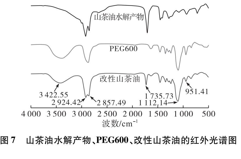用50 mL的乙酸乙酯飽和食鹽水溶液分3次萃取產(chǎn)物,除去未完全反應(yīng)的PEG600和山茶油水解產(chǎn)物,氮吹,干燥。對山茶油水解產(chǎn)物、PEG600和改性山茶油分別進行紅外性能表征,其紅外光譜圖如圖7所示。