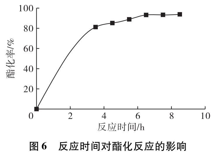 由圖6可知,隨著反應(yīng)時間的延長,反應(yīng)速率逐漸減慢,酯化率不斷增加,當(dāng)反應(yīng)時間為6.5 h之后反應(yīng)逐漸趨于平衡,繼續(xù)延長反應(yīng)時間對酯化率并沒有很大的影響。繼續(xù)延長反應(yīng)時間不僅會增加產(chǎn)物被氧化的風(fēng)險,而且還會造成資源浪費。綜合考慮,選擇反應(yīng)時間為6.5 h。