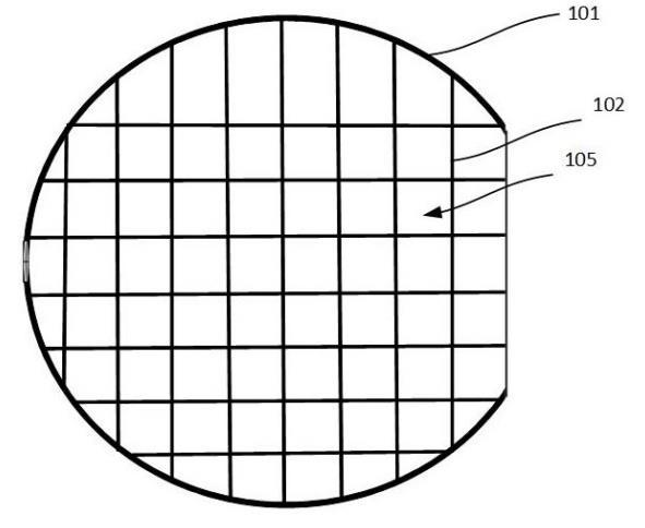 如圖1~圖2所示,本實施例提供一種用于晶圓104分區(qū)腐蝕的隔離網(wǎng)筒,所述隔離網(wǎng)筒包括:筒壁101,用于套設(shè)于晶圓104外圍,并與所述晶圓104共同被真空吸附臺103吸附固定;隔離網(wǎng)壁102,固定于所述筒壁101內(nèi),用于將晶圓104表面分隔成多個相互獨立的腐蝕區(qū)域105,當所述筒壁101被真空吸附臺103固定時,所述隔離網(wǎng)壁102延伸至晶圓104表面上方,并與晶圓104表面具有間距以形成非接觸氣隙,所述非接觸氣隙被配置為當腐蝕液進入某一個腐蝕區(qū)域105時,基于液體表面張力使得腐蝕液不會進入到與該腐蝕區(qū)域105相鄰的另一個腐蝕區(qū)域105。