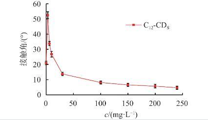 通過測試接觸角評價兩親性碳點的吸附性能,接觸角測定依據標準SY/T 5153—2017《油藏巖石潤濕性測定方法》。具體實驗步驟如下:將玻璃板浸泡在現(xiàn)配的食人魚溶液(濃硫酸∶雙氧水=3∶1)中1 min,進行表面羥基化的親水處理,再洗凈烘干;將玻璃板下半部浸泡在表面活性劑溶液中,上半部懸空,讓溶液保持攪拌狀態(tài),浸泡12 h后取出,自然晾干。利用光學接觸角測量儀(DSA100,Krüss,德國)測定表面活性劑溶液浸泡前后水滴在玻璃板上的靜態(tài)接觸角。玻璃的主要成分為硅酸鹽,因此可用玻璃板模擬硅酸鹽顆粒表面。通過測定玻璃板水滴靜態(tài)接觸角研究C12-CDS潤滑劑在玻璃表面的吸附性能,實驗結果見圖3。