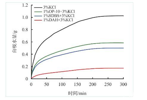 由圖5可以看出,水相會在毛細管力的作用下自吸入巖心,初始階段巖心的自吸水量較大,經(jīng)過200 min后達到平衡,自吸水量不再增加;加入DAH后,巖心自吸水量下降83.1%,且相較于常用防水鎖劑OP-10、SDBS效果更佳。圖6同樣表明,加入DAH后,巖心自吸水速率大幅降低,整個自吸過程中速率緩慢。上述實驗表明,DAH可以減少因毛細管力被吸入地層的水相,從而降低水鎖損害發(fā)生的風險。