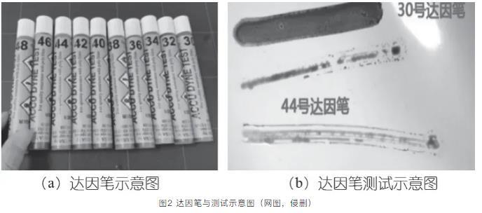 測試前先確定環(huán)境溫度、空氣濕度、以及被測物體表面溫度是否達(dá)到達(dá)因筆標(biāo)定的標(biāo)準(zhǔn)條件(溫差越大,測量誤差越大)。測試方法圖2(b)所示塑料袋張力測試,當(dāng)30mN/m筆測試時,在2 s內(nèi)達(dá)因筆潤濕了基材表面,沒有收縮或分散情況,說明表面張力等于或大于30 mN/m;當(dāng)44 mN/m筆測試時,在2 s內(nèi)達(dá)因筆沒有潤濕了基材表面,出現(xiàn)收縮或分散水珠情況,說明表面張力小于44 mN/m。還可用大于30 mN/m筆測量,以此類推,直到測試結(jié)果在2 s內(nèi)改縮成水珠(球狀),則這測試之前一次的值被視為基材表面能,并作比較用。塑料袋PP材質(zhì)在溫度20℃時表面張力是31~33 mN/m。達(dá)因筆使用方便,保質(zhì)期為6個月。