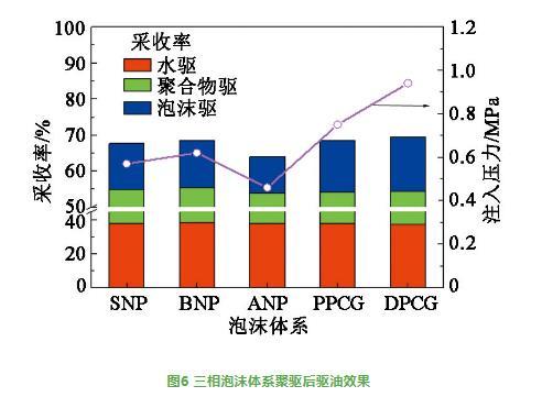 三相泡沫體系聚驅后驅油效果見圖6。由圖6可知,3支并聯(lián)巖心水驅采收率約為38%,聚驅采收率約為17%,聚驅后DPCG三相泡沫體系注入壓力和驅油效果最好,聚驅后采收率超過15%;PPCG體系次之,采收率超過14%。聚驅后SNP或BNP三相泡沫體系注入壓力和驅油效果相對較差,聚驅后采收率約為13%。聚驅后ANP三相泡沫體系注入壓力和驅油效果最差,但聚驅后采收率仍超過10%。