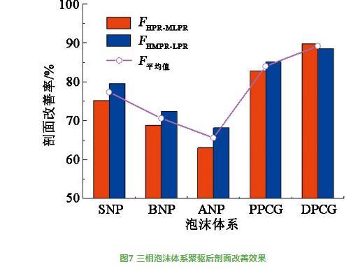 三相泡沫體系聚驅后剖面改善效果見圖7。由圖7可知,不同三相泡沫體系在高滲與中低滲層的剖面改善率(FHPR-MLPR)高于63%,在高、中滲與低滲層的剖面改善率(FHMPR-LPR)高于68%,平均改善率大于65%。其中DPCG或PPCG三相泡沫體系的FHPR-MLPR和FHMPR-LPR最好(超82%),DPCG三相泡沫體系的FHMPR-LPR低于FHPR-MLPR。SNP、BNP或ANP三相泡沫體系的FHPR-MLPR和FHMPR-LPR相對較差,但其FHMPR-LPR好于FHPR-MLPR。