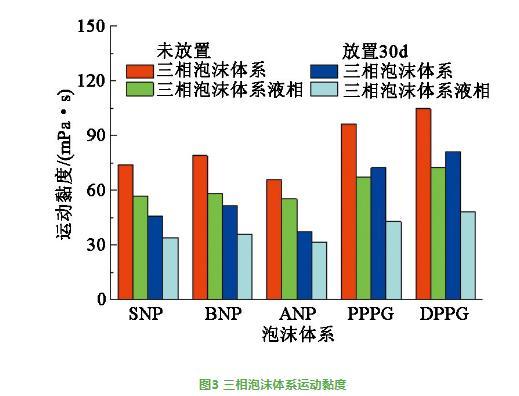 DPCG與DWS和聚合物具有較強的靜電、范德華力和纏繞作用,使其三相泡沫體系具有較大的拉伸黏度、剪切黏度和黏彈性,導致DPCG三相泡沫體系運動黏度最大。而PPCG僅具有短支鏈,與DWS和聚合物的靜電、范德華力和纏繞作用相對較弱,導致其運動黏度低于DPCG的。硬質納米顆粒在溶液中與DWS和聚合物的靜電、范德華力和纏繞作用較弱,因此其三相泡沫體系運動黏度較低。