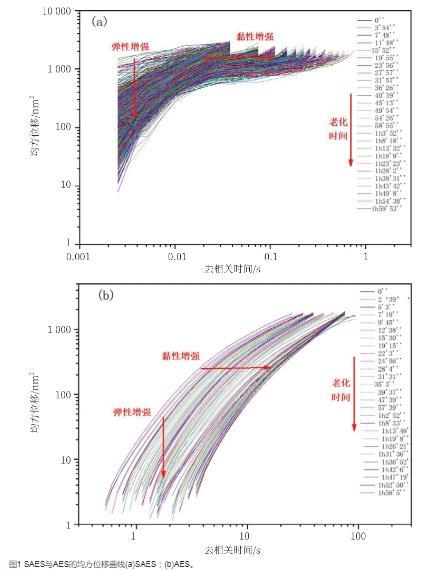 微流變可以通過跟蹤粒子的布朗運(yùn)動(dòng)獲得均方位移(mean square displacement,MSD)值測(cè)量樣品的黏彈性特性。從圖1中可以看出,隨著樣品老化時(shí)間的增加,SAES和AES的MSD曲線都是首先由長(zhǎng)位移向短位移轉(zhuǎn)變,即彈性增加,粒子間碰撞增加;去相關(guān)時(shí)間由短向長(zhǎng)的MSD曲線變化,表明二者的黏度增加。SAES和AES在樣品老化過程中,其結(jié)構(gòu)都發(fā)生了變化,黏彈性都有所增加。從圖1中還可以看出,SAES和AES的黏彈性差別較大,在老化過程中SAES黏彈性變化較小,而AES的黏彈性變化較大。