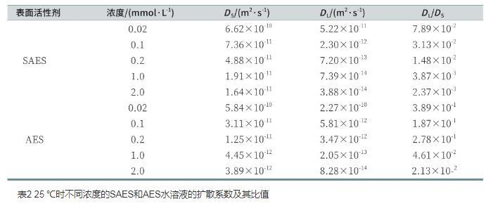 表2 25℃時(shí)不同濃度的SAES和AES水溶液的擴(kuò)散系數(shù)及其比值