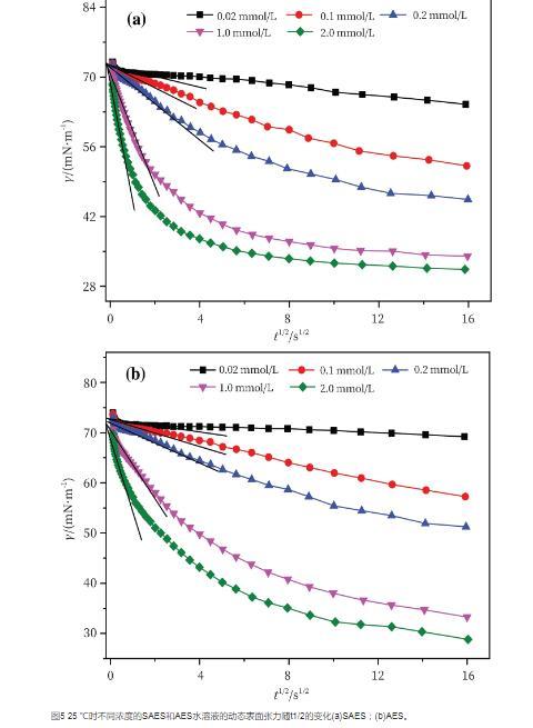 圖4 25℃時(shí)不同濃度的SAES和AES水溶液的動(dòng)態(tài)表面張力(a)SAES;(b)AES。
