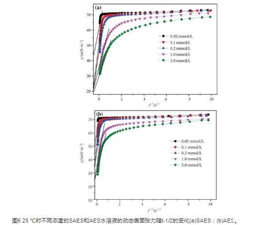 從圖4可以看出所測(cè)不同濃度不同表面活性劑的表面張力在初始階段均快速下降,一定時(shí)間后趨于平穩(wěn)狀態(tài)。這是因?yàn)閯?dòng)態(tài)表面張力測(cè)試過程中新形成的表面遠(yuǎn)偏離于平衡態(tài),吸附層離子的濃度很低,體相與吸附層的濃度差大,因此動(dòng)態(tài)表面張力變化很大。隨著吸附的進(jìn)行,次表面濃度和表面濃度逐漸增大,擴(kuò)散和吸附的速度均逐漸降低,動(dòng)態(tài)表面張力隨著吸附時(shí)間的增加而降低的趨勢(shì)也逐漸變得平緩。當(dāng)表面活性劑濃度增大時(shí),表面張力的下降幅度和速度也隨之增大,而且相應(yīng)地縮短了到達(dá)平衡狀態(tài)的時(shí)間。這種隨體系濃度的增加達(dá)到平衡所需的時(shí)間越短的趨勢(shì)與已經(jīng)報(bào)道的一些烷基表面活性劑的結(jié)果是相一致的。在相同濃度下,SAES表面張力下降的速率大于AES,這是由于SO4-在碳?xì)滏溨虚g的化合物比在端點(diǎn)者擴(kuò)散速度快。