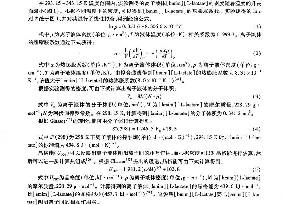 離子液體物理化學(xué)性質(zhì)的研究對(duì)離子液體的設(shè)計(jì)和應(yīng)用具有重要的指導(dǎo)作用,而對(duì)于離子液體與分子溶劑(例如水)的混合物性質(zhì)研究將會(huì)揭示該類液體的新的應(yīng)用。筆者在不同溫度下測(cè)定帶有手性陰離子的純離子液體1-丁基-3-甲基-咪唑乳酸鹽([bmim][L-lactate])及[bmim][L-lactate]+H2O二元混合物的密度和表面張力,并對(duì)其體積性質(zhì)和表面性質(zhì)進(jìn)行研究。以期進(jìn)一步豐富手性離子液體與分子溶劑二元混合物的物理化學(xué)性質(zhì)數(shù)據(jù),為其應(yīng)用提供更多的理論依據(jù)。