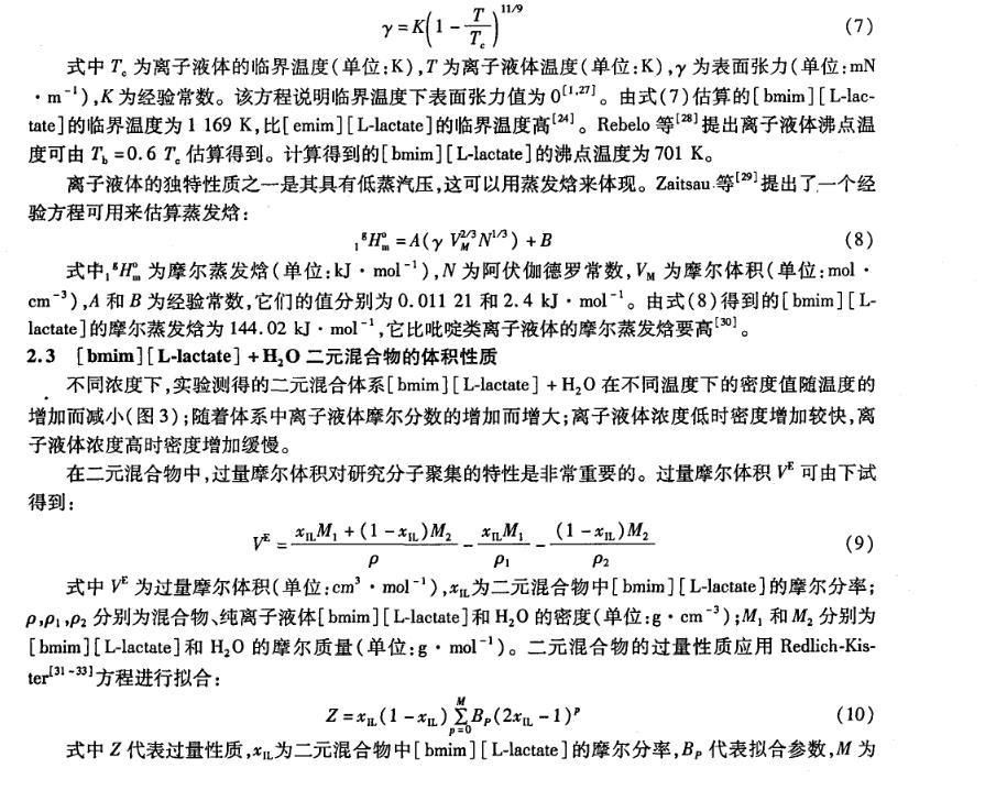 本次研究測定了不同溫度下手性離子液體[bmim][L-lactate]以及二元混合物[bmim][L-lactate]+H2O的密度和表面張力。結(jié)果表明,離子液體的密度和表面張力均隨著溫度的增加而減小;并且對純離子液體的熱膨脹系數(shù)、表面熵、表面焓以及其臨界溫度進(jìn)行了計(jì)算。研究了二元混合物的體積性質(zhì)(過量摩爾體積、偏摩爾體積、表觀摩爾體積、過量偏摩爾體積)、表面性質(zhì),發(fā)現(xiàn)二元混合物的密度隨溫度的增加而減小;所研究的二元混合體系的密度均隨著體系中離子液體摩爾分?jǐn)?shù)的增加而增大;混合物中手性離子液體與分子溶劑間具有強(qiáng)的相互作用。