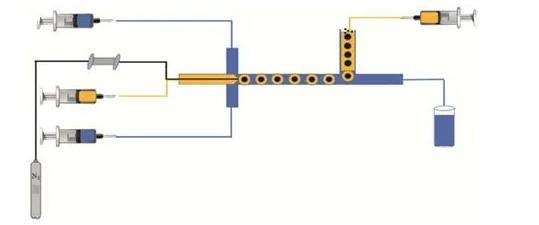 已有的研究結果表明微尺度氣液液三相流具有獨特的流動、傳遞及反應規(guī)律,在化學反應、材料制備、萃取分離等多個領域均有著重要的應用。在化學反應領域,Onal等曾以氫氣作為氣相,不飽和醛類為連續(xù)相,催化劑的水溶液為分散相,在該體系中系統(tǒng)研究了不飽和醛類選擇性加氫的過程并揭示了反應動力學。在材料制備領域,Lee等曾以氮氣作為內相,含有硅納米顆粒的甲苯溶液作為中間相,連續(xù)相為2%PVA水溶液。在該體系中隨著雙乳液油相中甲苯溶劑的揮發(fā),逐漸形成了硅納米顆粒堆積殼層的中空微球。