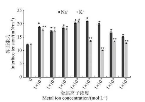 已有研究結(jié)果表明,電解質(zhì)的加入能使溶液內(nèi)部粒子之間的相互作用強于純水。因此,在一定濃度范圍內(nèi),電解質(zhì)的加入會使油/水溶液界面張力增大。本研究就Na+、K+離子對油水界面組成與結(jié)構(gòu)的影響進(jìn)行了驗證研究。如圖2所示,Na+、K+對界面張力的影響相似,對麥胚LA界面張力的影響隨其濃度的增加呈現(xiàn)先增加后降低的趨勢,但高濃度時K+對油水界面張力的影響不及Na+顯著(P<0.05)。當(dāng)離子濃度在1.0×10-9~1.0×10-6mol/L時,Na+、K+均可明顯提高界面張力。當(dāng)K+濃度高于1.0×10-5mol/L,麥胚LA的油水界面張力開始明顯降低。原因可能是高濃度無機(jī)鹽離子將影響麥胚LA在溶液界面上的聚集數(shù)量和穩(wěn)定性。由于麥胚LA具有類似于分子表面活性劑的性質(zhì),可以緊密吸附界面上,從而降低界面張力。