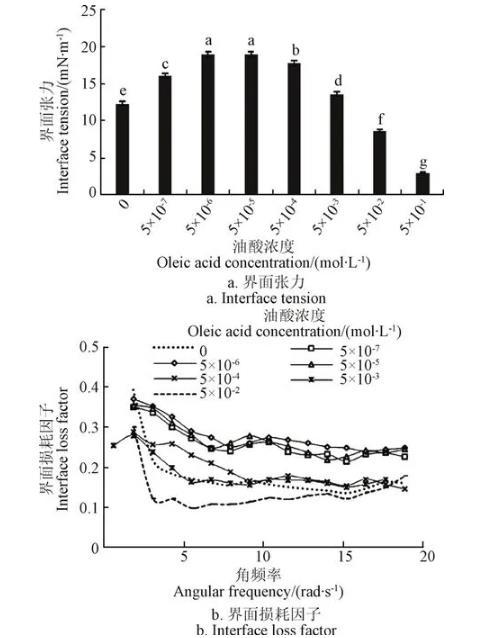 三油酸甘油酯濃度對油水界面特性的影響見圖6。由圖6可見,當(dāng)麥胚LA濃度為1.70×10-6mol/L時,油水界面張力隨癸烷中三油酸甘油酯濃度的增加呈現(xiàn)先增加后減小的變化規(guī)律;當(dāng)三油酸甘油酯濃度介于10-5~10-3mol/L時,相同角頻率時界面損耗因子隨著濃度增加無明顯變化規(guī)律。此外,在試驗過程中,界面張力隨時間延長呈現(xiàn)一定下降趨勢,這說明麥胚LA與三油酸甘油酯的水解過程也會對界面張力產(chǎn)生一定影響。原因在于,在界面體系中,三油酸甘油酯可被麥胚LA水解,產(chǎn)生小分子的油酸等,三油酸甘油酯與麥胚LA組成的界面發(fā)生變化,進(jìn)而影響界面特性。