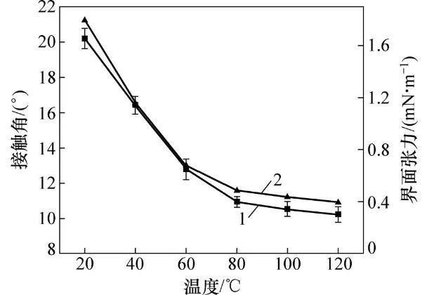 對(duì)20,40,60,80,100和120℃溫度下DBTL在CBT500光滑薄板上靜態(tài)接觸角進(jìn)行測(cè)量,結(jié)果如圖4所示。結(jié)合上述溫度下DBTL界面張力1(如圖3所示),將和1代入式(3),計(jì)算相應(yīng)溫度下DBTL與CBT500的接觸角法界面張力12,結(jié)果如圖4中界面張力所示。由圖4可知:隨著溫度升高,接觸角和接觸角法界面張力具有相同的下降規(guī)律,不同溫度區(qū)間內(nèi)下降趨勢(shì)不同,20~60℃溫度區(qū)間下降趨勢(shì)最大,60~80℃溫度區(qū)間下降趨勢(shì)次之,80~120℃溫度區(qū)間下降趨勢(shì)平緩。由Young方程可得cos=(2?12)/1,代入上述關(guān)系,即溫度升高,接觸角減?。怀送?,不同溫度區(qū)間內(nèi),DBTL對(duì)CBT500初期誘導(dǎo)率不同,從而導(dǎo)致不同溫度區(qū)間內(nèi)靜態(tài)接觸角、界面張力下降趨勢(shì)不一致。