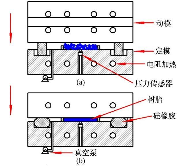 測(cè)定薄板分別由2種材料CBT500和PP制成,用于一定溫度下不同材料液滴在相應(yīng)薄板上靜態(tài)接觸角的測(cè)量。采用抽真空熱壓工藝制備光滑薄板,成型工藝參數(shù)如表1所示,具體過程為:采用信易SCD?20μ/30H干燥機(jī)對(duì)CBT500和PP顆粒進(jìn)行干燥,干燥溫度、時(shí)間分別為80℃和24 h。采用HH?138的精密烤箱對(duì)干燥后CBT500和PP顆粒分別進(jìn)行預(yù)加熱,加熱溫度分別為140℃和160℃,加熱時(shí)間均為0.5 h。將預(yù)加熱CBT500和PP顆粒分別倒入溫度為130℃和150℃的模具中,采取抽真空熱壓工藝制備CBT500和PP光滑薄板。抽真空熱壓工藝包括6個(gè)階段:1)動(dòng)模降至密封圈;2)抽真空;3)施壓;4)保壓;5)冷卻;6)開模取件。為獲得良好的密閉空間,動(dòng)模應(yīng)迅速下降至密封圈并微壓,如圖2(a)所示。抽真空后,施加壓力將CBT500和PP顆粒壓實(shí),制成相應(yīng)光滑薄板,如圖2(b)所示。