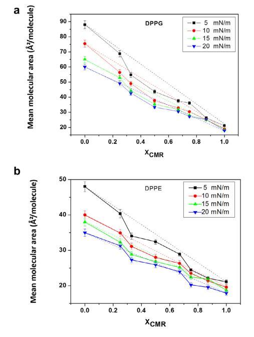 純和混合單層的 pA 等溫線與分子面積的關(guān)系如圖 1 所示。CMR/DPPG 等溫線顯示出與純 DPPG 脂質(zhì)相似的趨勢(圖 1a)。 相似相 對(duì)所有 CMR/DPPG 混合物都觀察到了轉(zhuǎn)變。 DPPG 和 DPPC 顯示崩潰壓力 (DPcoll) 為 52 mN.m-1 次方和 60 mN.m-1次方 , 分別。 一個(gè)過渡 (p ffi 3 mN.m-1次方 ) 從液體 發(fā)現(xiàn)純 DPPE 單層膨脹為凝聚相 與 D. coll 在 ffi55 mN.m-1次方 . 為 D. coll 獲得的值 純脂質(zhì)與文獻(xiàn)一致(Vollhardt 等人, 2000; 諾沃塔斯卡等人,2014 年)。
