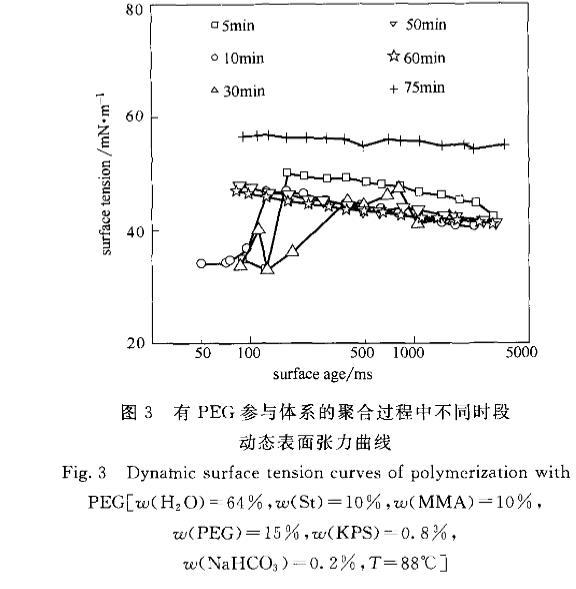 由于PEG的存在,使St/MMA在水相中經(jīng)歷了不一樣的聚合過程,PEG會(huì)使體系的反應(yīng)速率變慢,當(dāng)反應(yīng)到50min時(shí)轉(zhuǎn)化率只有49,而無PEG參與的體系在30min時(shí)聚合已接近終點(diǎn),轉(zhuǎn)化率達(dá)到98以上。St/MMA和引發(fā)劑形成的聚合物在PEG的作用下,形成了一種具有更強(qiáng)表面活性的聚合物,其表面活性水平高于PEG以及無PEG參與的聚合體系的聚合物,但弱于混合單體及齊聚物。這種較強(qiáng)表面活性的聚合物在轉(zhuǎn)化率只有5的時(shí)候就已經(jīng)存在,是聚合物進(jìn)入粒子堆形成小粒子且穩(wěn)定粒子的動(dòng)力,并最終使粒子帶有足夠脫離粒子堆的表面電荷。