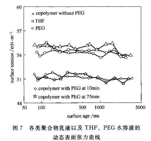 圖7各類聚合物乳液以及THF、PEG水溶液的動(dòng)態(tài)表面張力曲線