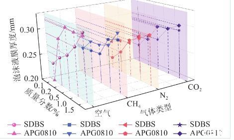 對比相同質(zhì)量分?jǐn)?shù)下不同氣體注入時表面活性劑泡沫液膜厚度進(jìn)行分析。注入空氣情況下,溶液質(zhì)量分?jǐn)?shù)0.15%時,APG0810溶液在泡沫液膜最大,約為0.315 mm,注入甲烷泡沫液膜厚度比空氣低0.006 mm,SDBS溶液泡沫液膜厚度為0.297 mm,注入甲烷泡沫液膜厚度比空氣低0.004 mm,這是由于甲烷氣體密度低于空氣,擴(kuò)散速率比空氣快。APG0810和SDBS溶液在二氧化碳注入時比空氣分別低0.002 mm和0.004 mm。這是由于二氧化碳?xì)怏w為酸性氣體,離子型表面活性劑溶液在酸性環(huán)境不易形成泡沫液膜結(jié)構(gòu),非離子表面活性劑溶液則不易受酸堿度干擾。