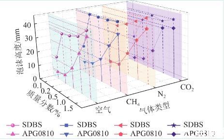 對比同一種溶液通入不同氣體的高度進(jìn)行分析,空氣、氮?dú)饧岸趸甲⑷胍后w發(fā)泡性規(guī)律基本一致,均在質(zhì)量分?jǐn)?shù)最高時發(fā)泡率達(dá)到最大。通入甲烷時則在SDBS溶液質(zhì)量分?jǐn)?shù)為0.02%時就達(dá)到了與0.15%接近的發(fā)泡高度。APG0810在甲烷注入時也比其他氣體總體發(fā)泡率高,這是由于甲烷的摩爾質(zhì)量最低,氣體密度低,分子擴(kuò)散快,泡沫膨脹速率變快導(dǎo)致的。