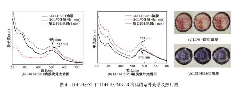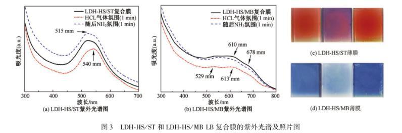 圖3(a)和3(b)分別顯示的是LDH-HS/ST和LDH-HS/MB多層LB復(fù)合膜沉積在石英底片上測得的UV光譜,以及經(jīng)1 min HCl氣體氛圍處理后和1 min NH3氣體氛圍處理后的UV變化光譜圖。圖3(c)和3(d)對(duì)應(yīng)展示了LDH-HS/ST和LDH-HS/MB復(fù)合膜酸堿氣體氛圍下石英片顏色變化前后對(duì)比圖。