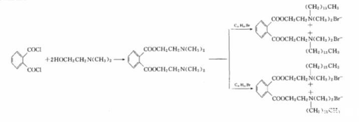 在100mL反應(yīng)瓶中,加入6.2g鄰苯二甲酰氯、10mL甲苯,冰浴條件下攪拌滴加6.0g N,N-二甲基乙醇胺,加完后升溫至60℃反應(yīng)2h。反應(yīng)結(jié)束后冷卻至室溫加入質(zhì)量分?jǐn)?shù)10%的碳酸鉀水溶液中和并分液,用20mL的甲苯萃取水相,合并有機(jī)相,無水硫酸鎂干燥、過濾蒸出甲苯后得到二(二甲基胺基乙基)鄰苯二甲酸酯6.5g,收率為69.4%。分別稱取2.0g的二(二甲基胺基乙基)鄰苯二甲酸酯各和5.6g的正溴代十四烷和4.7g的正溴代十六烷于100mL的反應(yīng)瓶中,加入溶劑丙酮回流反應(yīng)24h,冷卻過濾烘干,得到略帶黃色的固體粉末3.9g和4.9g,收率分別為68.5%和73.6%,兩步反應(yīng)的總收率分別為46.1%和49.7%,經(jīng)乙腈重結(jié)晶后,得白色晶體,測得SHZ14、SHZ16熔點(diǎn)分別為128~130℃和133~135℃。