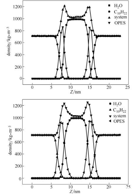 本文提取體系穩(wěn)定的S80、S120進(jìn)行分析,兩個(gè)體系的各部分密度圖如圖4所示。在平衡狀態(tài)下兩體系中水的平均密度分別為989.86 kg·m-3、992.43 kg·m-3,與國際溫標(biāo)318 K時(shí)水密度990.2 kg·m-3值接近;另外,兩體系中癸烷平均密度為711.49 kg·m-3、710.72 kg·m-3,與真實(shí)狀況下癸烷密度711.2 kg·m-3值接近,這表明模擬體系的模型選擇、力場(chǎng)參數(shù)都是準(zhǔn)確的,可以得出可靠結(jié)論。