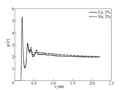 圖10中曲線分別代表在2%NaCl溶液、2%CaCl2溶液中磺酸基中的氧原子與水中氫原子之間的徑向分布函數(shù),如圖所示兩條曲線的峰值并未有太大差別,這說明OPES對(duì)Na+、Ca2+都有很好的抗鹽性。