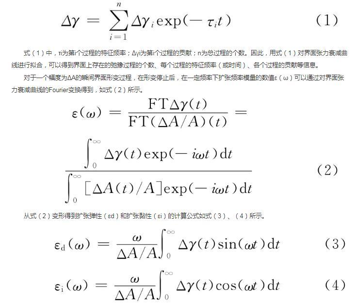 本研究中采用界面張力弛豫法,通過對受擾動界面張力衰減曲線擬合獲得界面張力改變量隨時(shí)間變化的函數(shù)關(guān)系,再經(jīng)過Fourier變換,計(jì)算得到界面擴(kuò)張參數(shù)的全頻率譜,從而獲得界面上活性分子行為的信息。